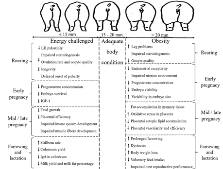 Maintaining backfat thickness within an optimal range—16–20 mm for sows and 15–19 mm for gilts—is crucial to prevent reproductive issues related to poor body condition. Obesity or underweight should be avoided in all phases of the sow reproductive cycle, as deviations of normal body condition in one phase can exert carry-over deleterious effects in subsequent reproductive phases that could lead to severe impairments in performance (Figure 1).